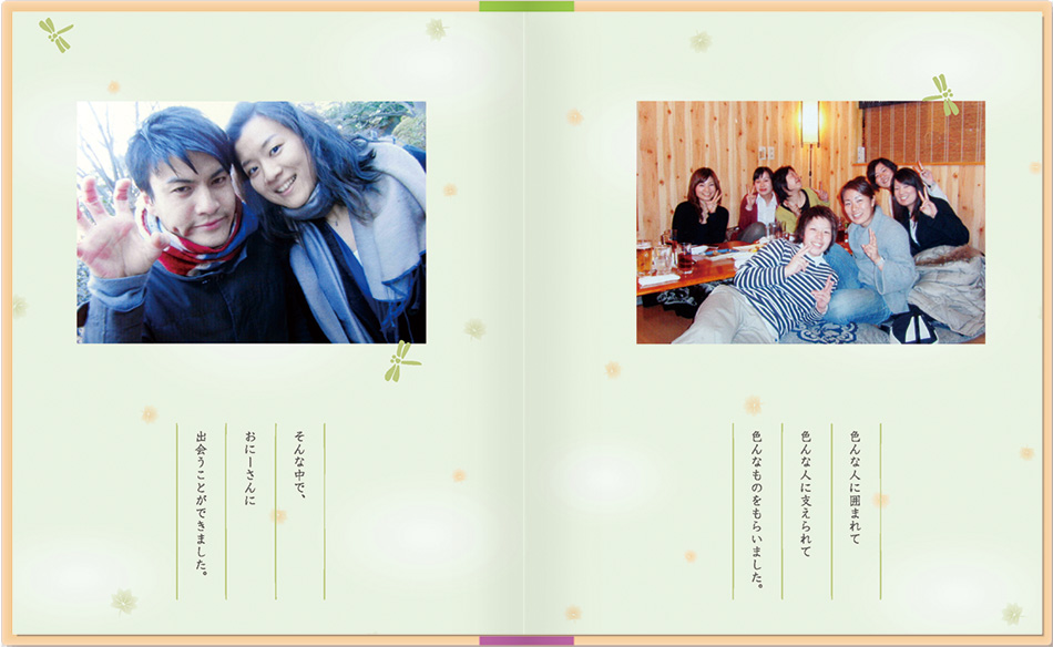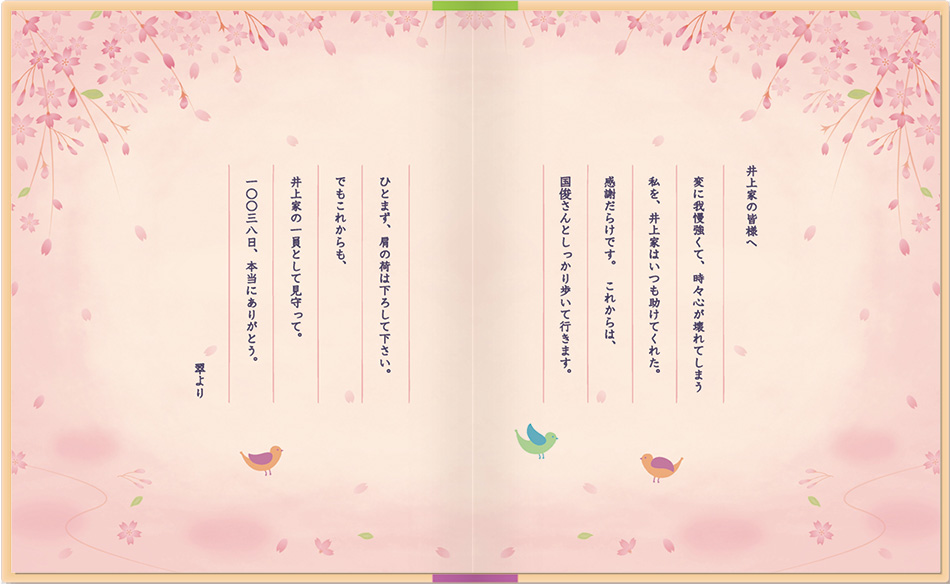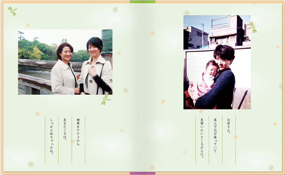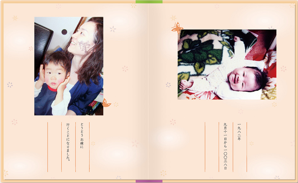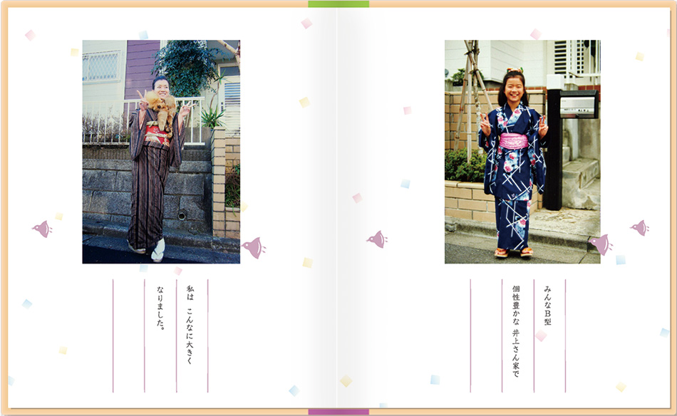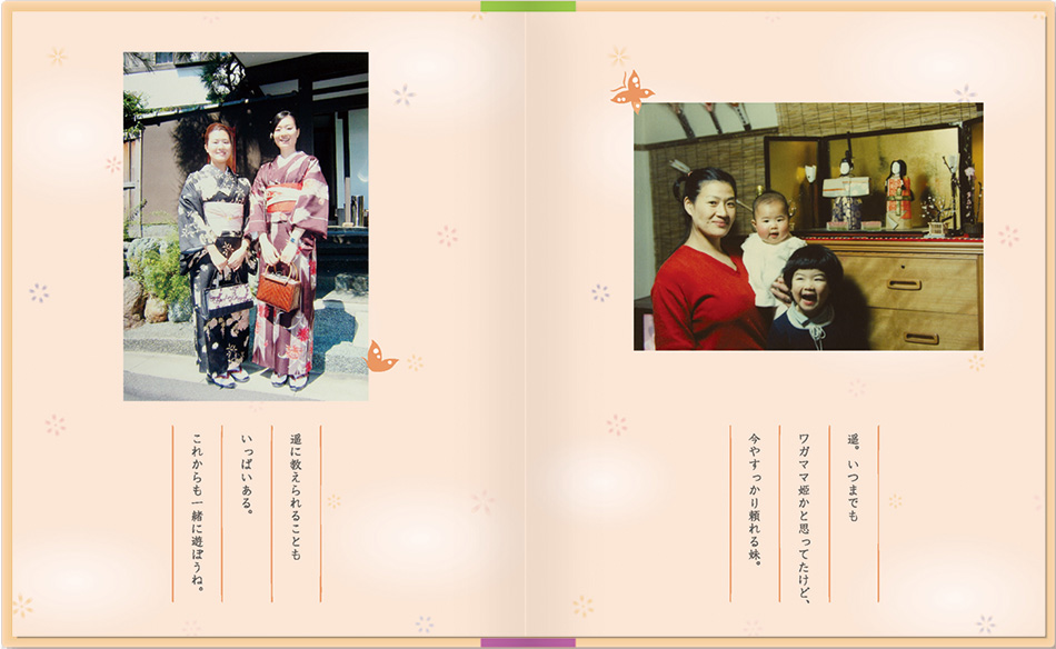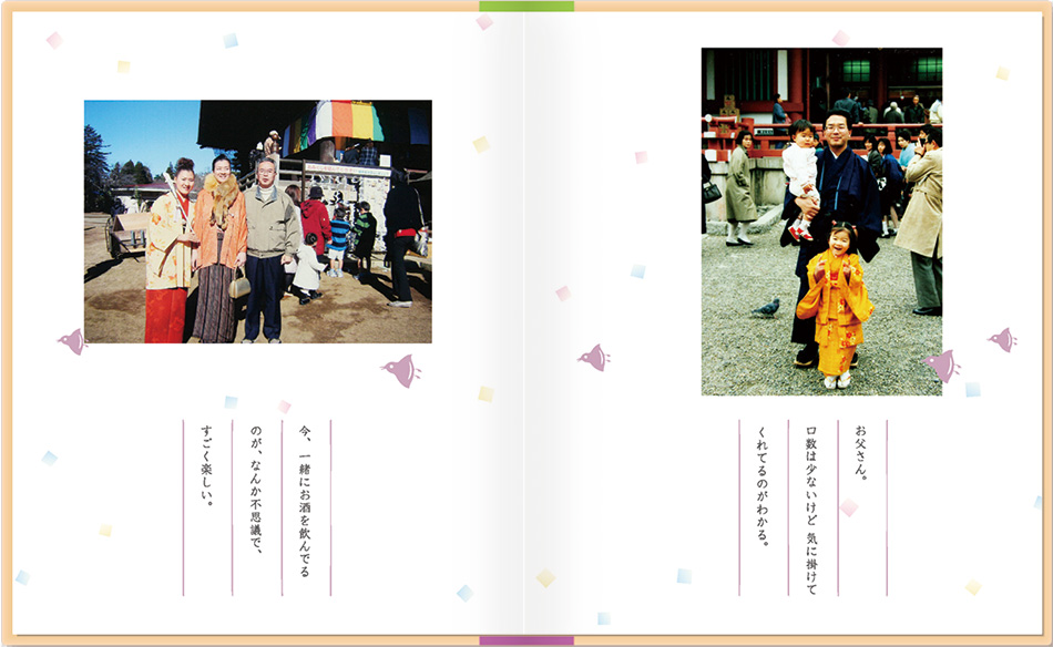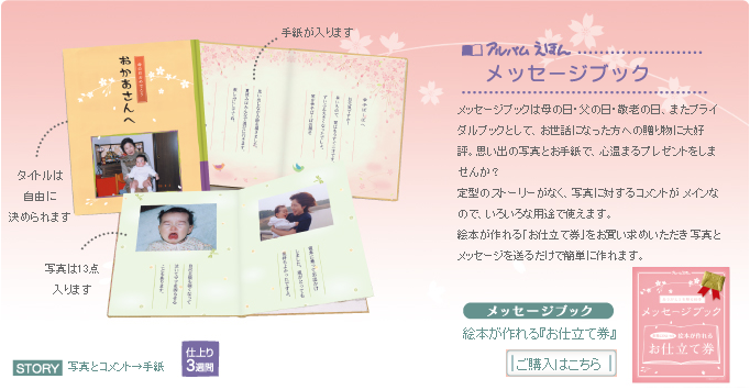 メッセージブックは母の日・父の日・敬老の日、またブライダルブックとして、お世話になった方への贈り物に大好評。思い出の写真とお手紙で、心温まるプレゼントをしませんか?定型のストーリーがなく、写真に対するコメントが メインなので、いろいろな用途で使えます。絵本が作れる「お仕立て券」をお買い求めいただき 写真とメッセージを送るだけで簡単に作れます。